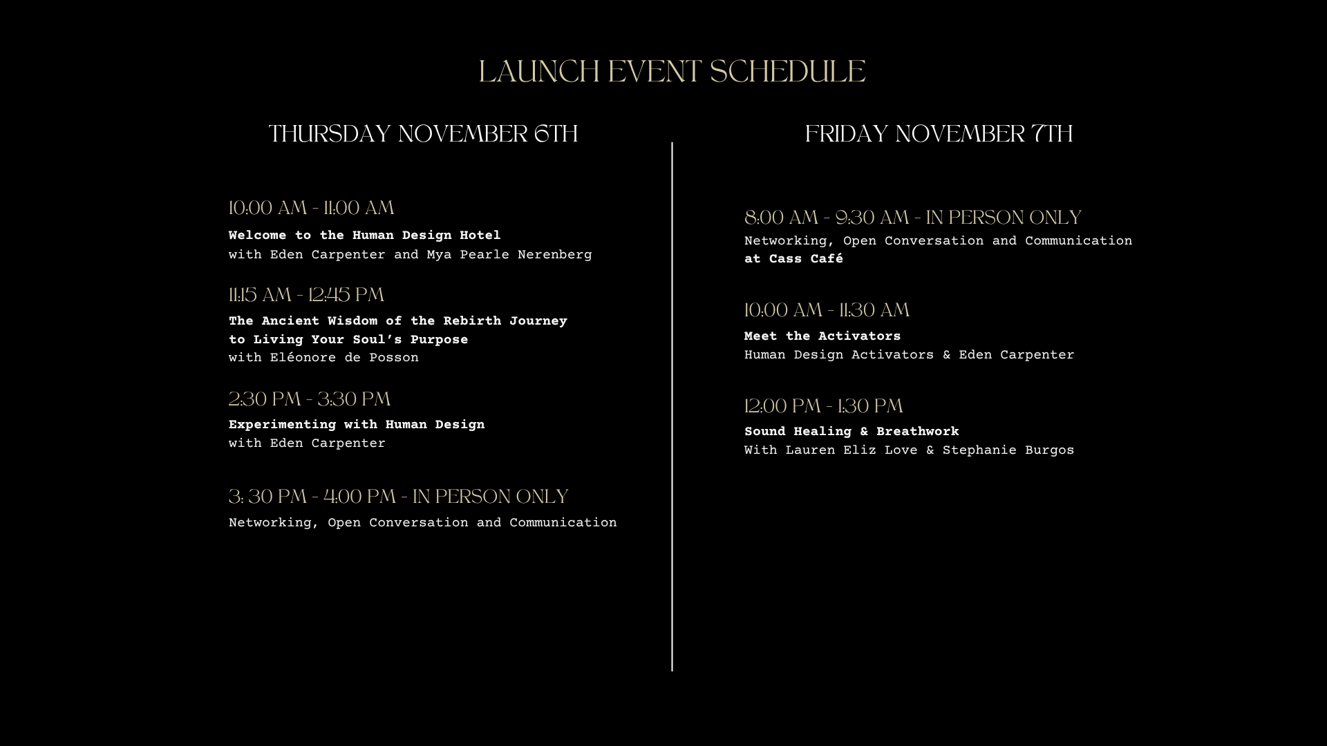 Welcome to an inspiring week as we launch the world’s first Human Design Hotel! Join international and local experts as they share groundbreaking insights and practical wisdom to elevate your life and business.